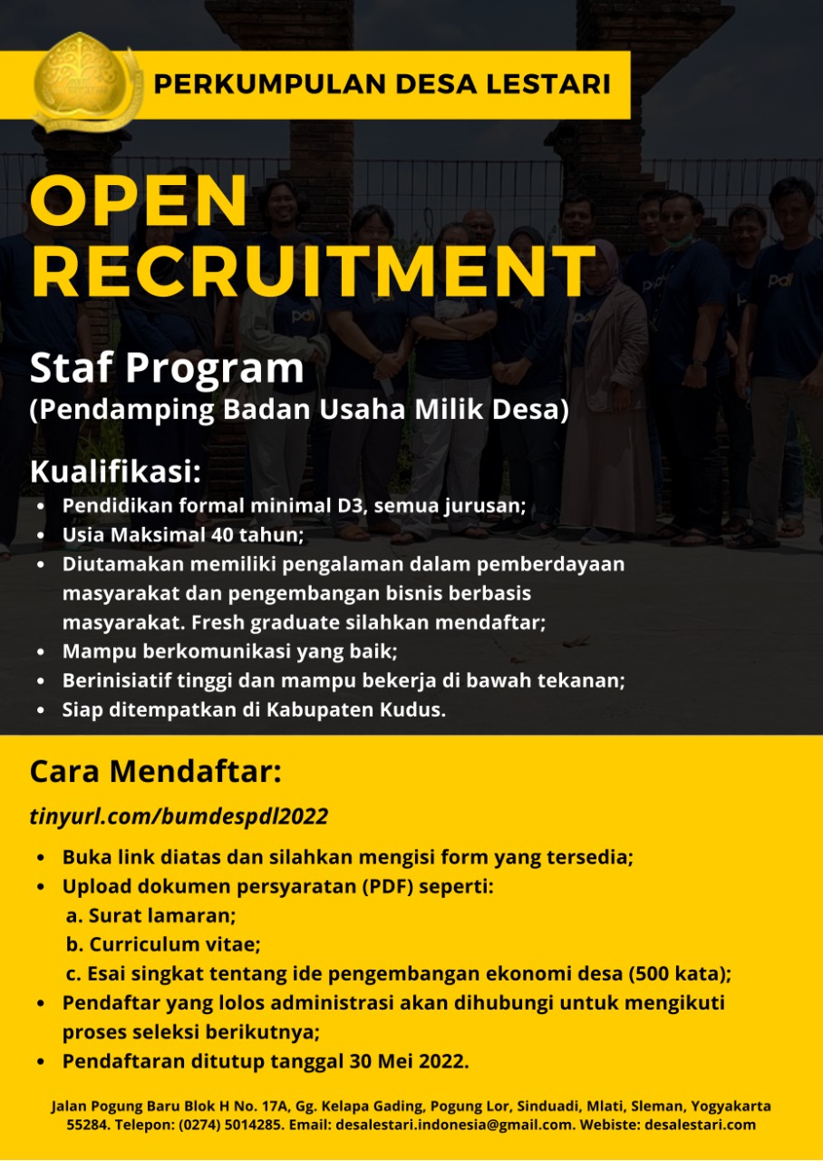 Perkumpulan Desa Lestari sedang mencari Staf Program untuk mendampingi Badan Usaha Milik Desa (BUMDes) yang berlokasi kerja di Kabupaten Kudus, Jawa Tengah. Bagi yang berminat dan memenuhi kualifikasi, silakan unggah berkas pendaftaran di sini.